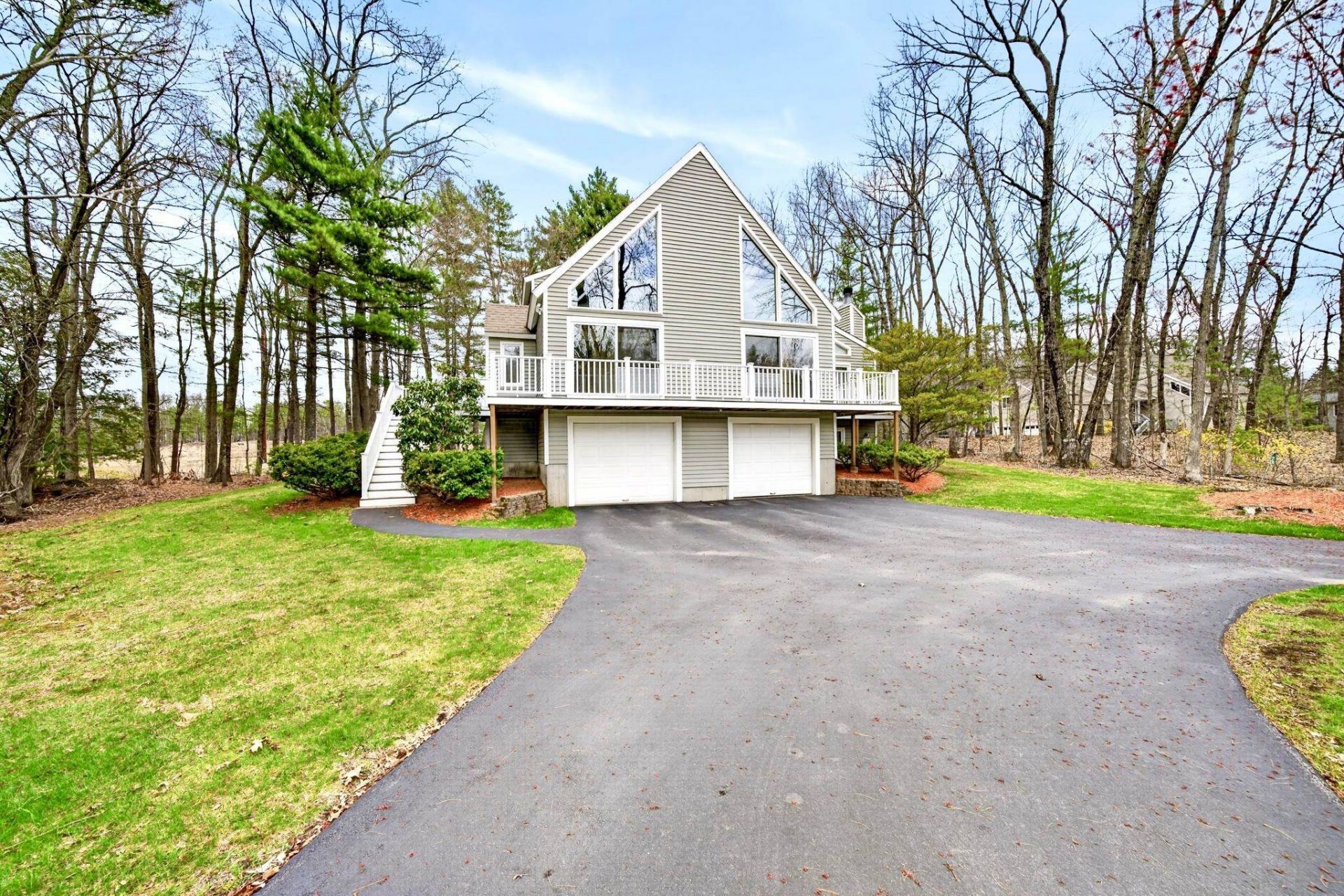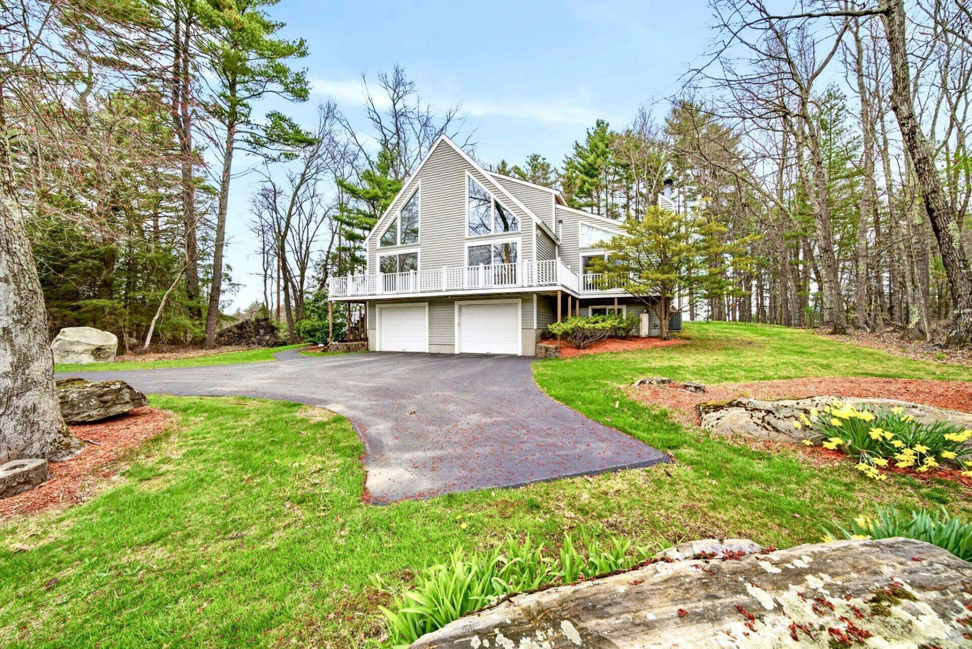 A STUNNING LONDONDERRY CONTEMPORARY TO CALL. YOUR OWN! Welcome to this beautifully maintained home nestled on a quiet cul-de-sac, in highly sought after Londonderry, with easy access to shopping, dining, and major commuting routes. This inviting property offers the perfect blend of comfort, functionality, and New England charm. Step inside to discover a massive and thoughtfully designed interior featuring soaring cathedral ceilings with an exposed balcony to the second level, with expansive windows allowing for sun-filled living areas, gleaming floors, and a warm, welcoming atmosphere throughout. The open concept main level boasts a bright and open layout ideal for both everyday living and entertaining, with a generously sized living room equipped with a wood stove, flowing seamlessly into the family room, dining area and kitchen. The kitchen is well-appointed with ample cabinetry, plenty of counter space, and modern appliances. The cozy den is equipped with a gas fireplace and provides access to a private back deck, as well as front wrap-around deck, overlooking the beautifully landscaped yard. Additionally on the main level is a large bedroom, ideal for a sleeping area or a home office, and a 3/4 bathroom, complete with laundry area. Upstairs, the home features two large-sized bedrooms, including a primary en-suite complete with skylights, great closet space and easy access to a full bath with jacuzzi tub and shower stall. The lower level offers additional potential finished living space with great opportunity for a family room, gym, or workspace, along with convenient storage options. Outside, the property shines with a well-maintained yard, mature landscaping, and plenty of room for outdoor enjoyment. Additional highlights include a large 2-car garage, outdoor shed for storage, a chicken coop, and a location that combines neighborhood charm with commuter convenience?just minutes to I-93. DO NOT MISS THIS ABSOLUTE GEM!